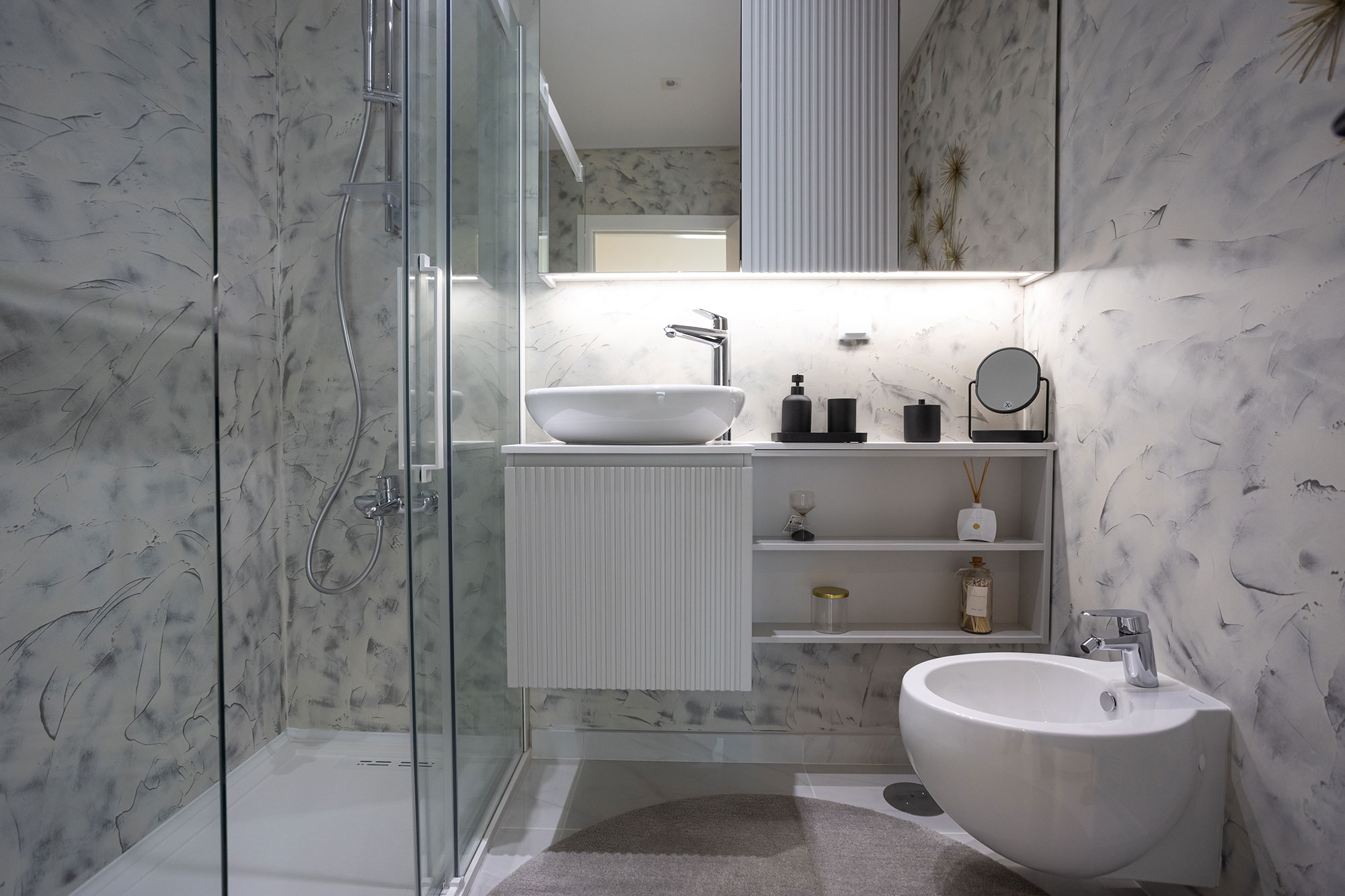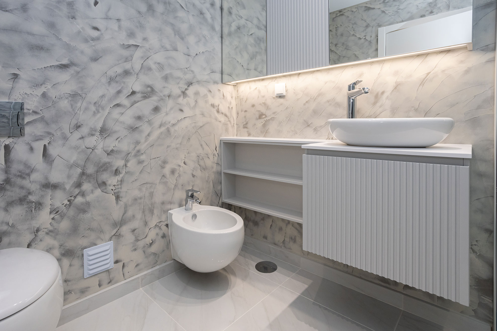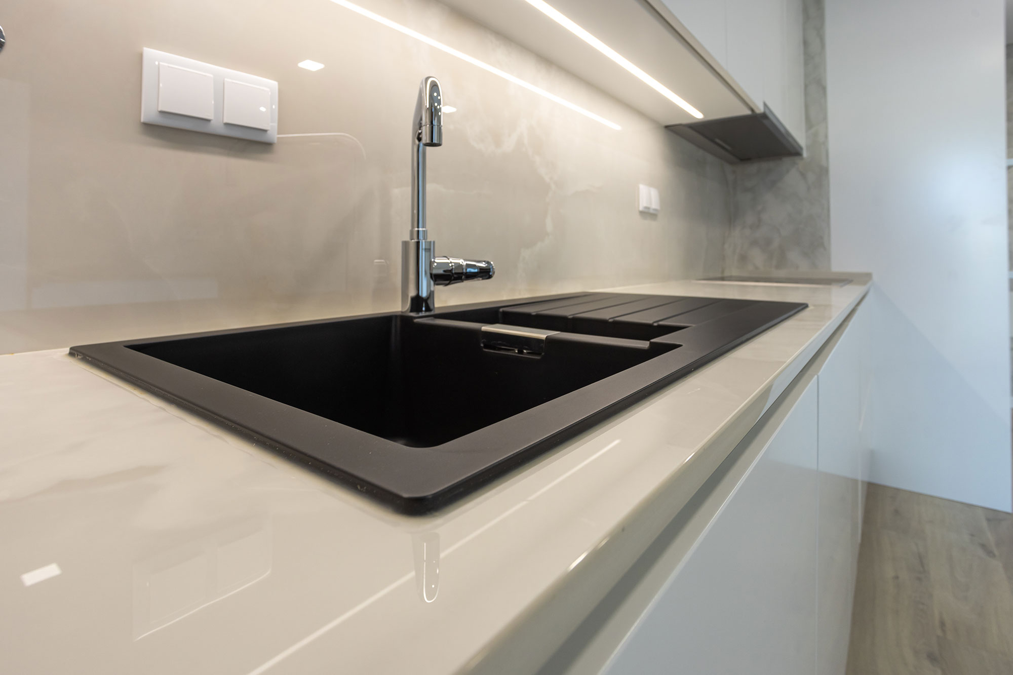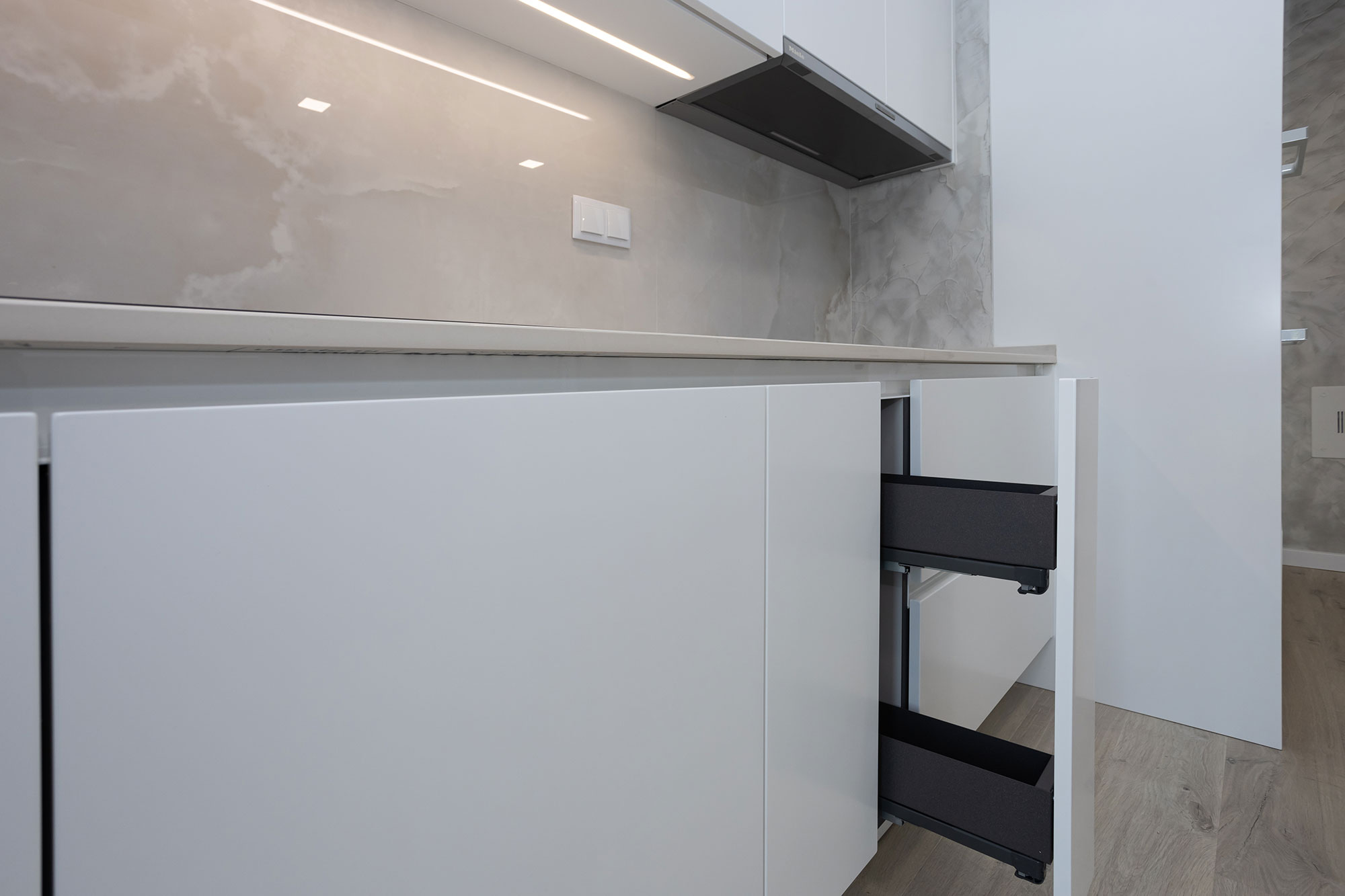 Móveis lacado a branco e cinza, com leds embutidos nas gavetas.