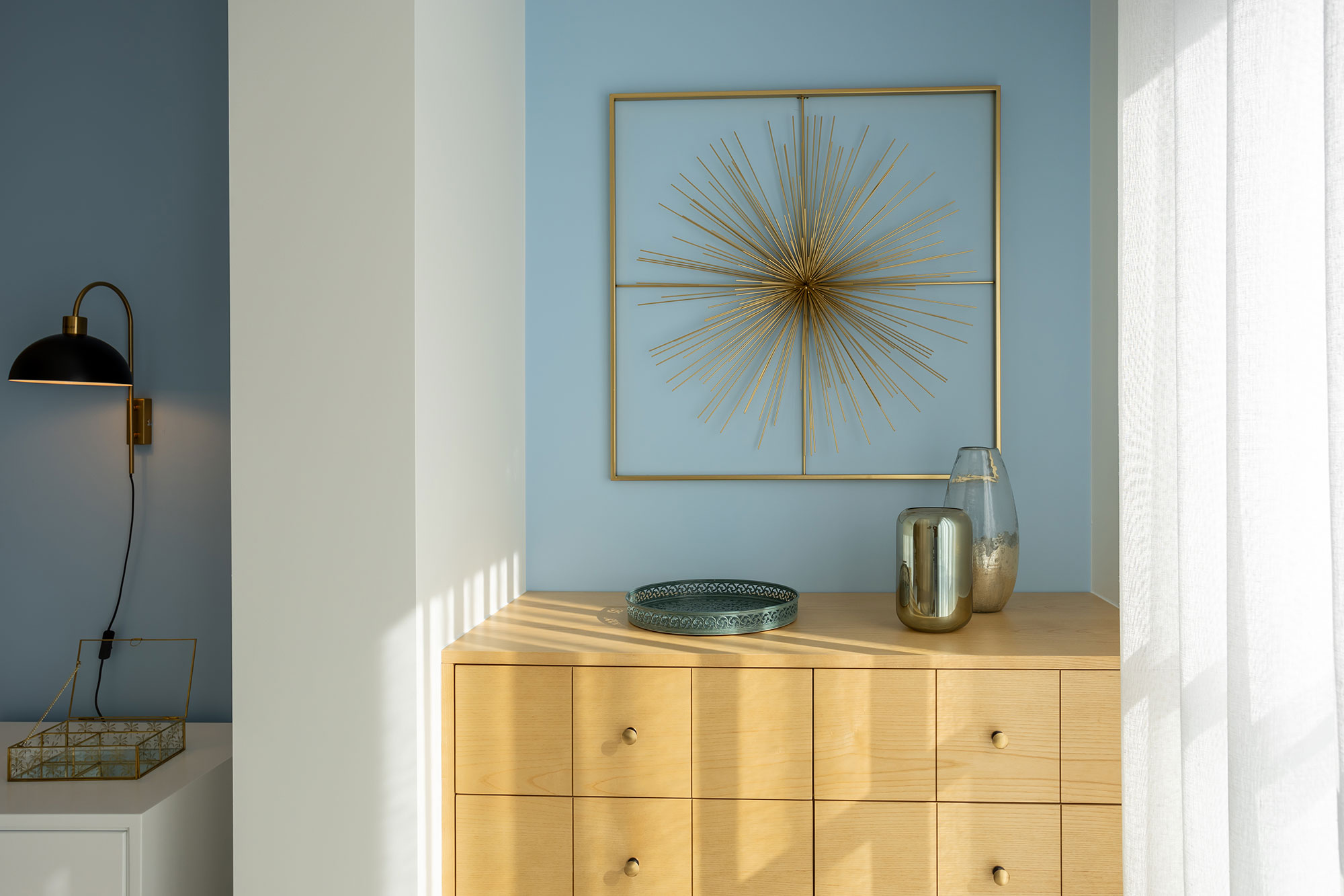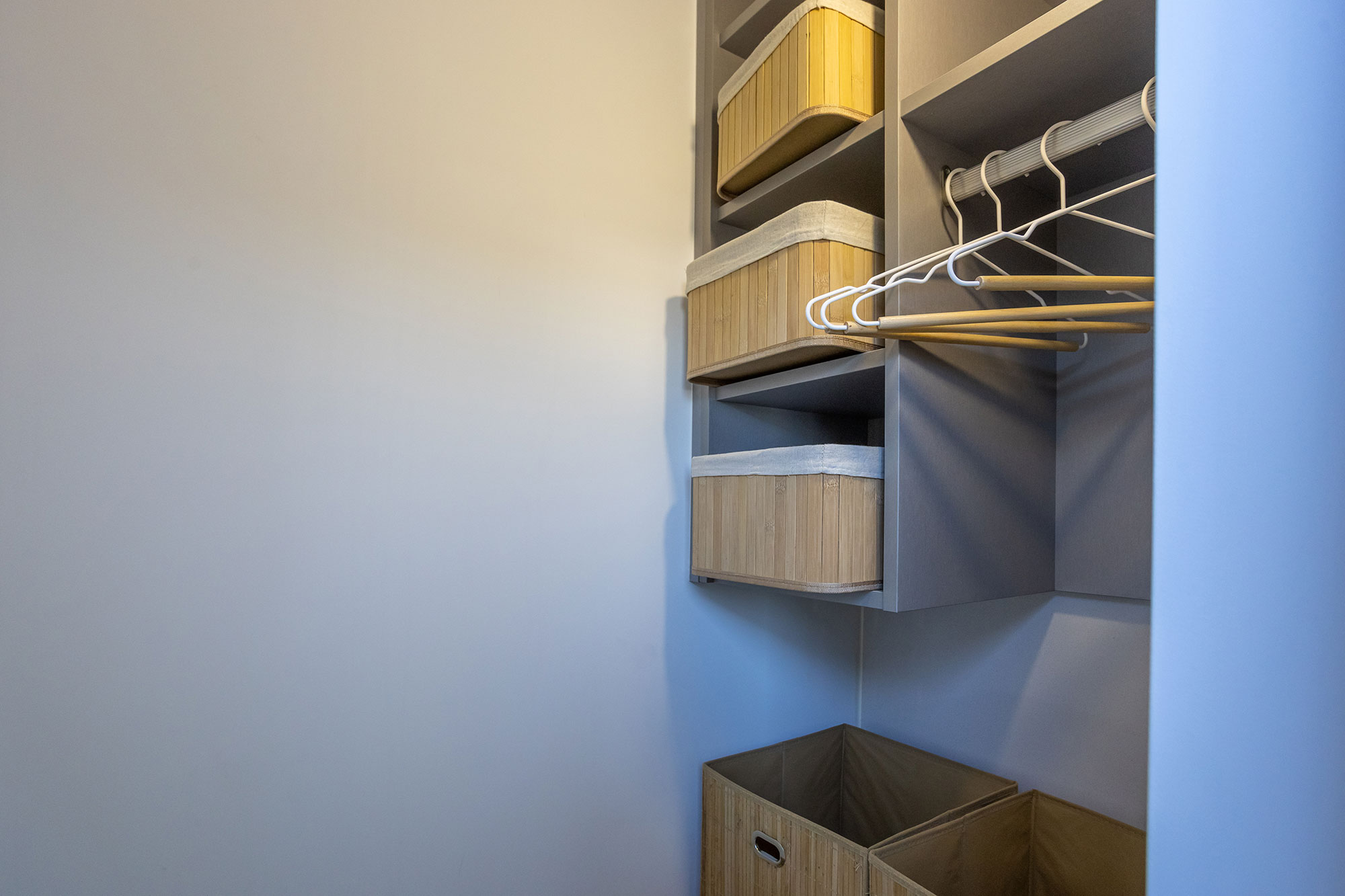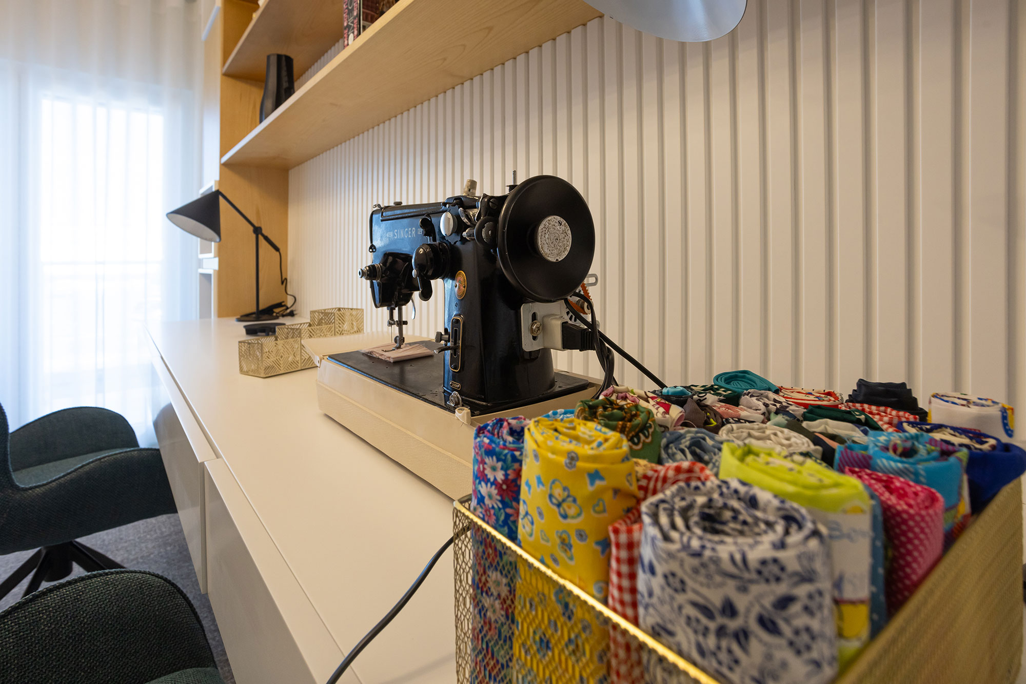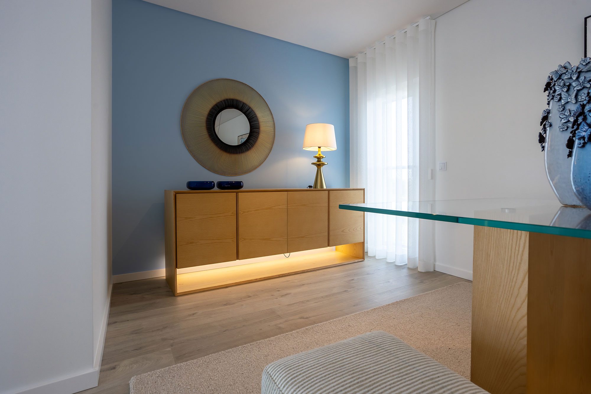 Móveis lacado a branco e cinza, com leds embutidos nas gavetas.