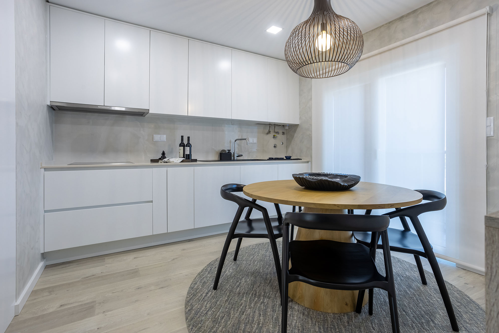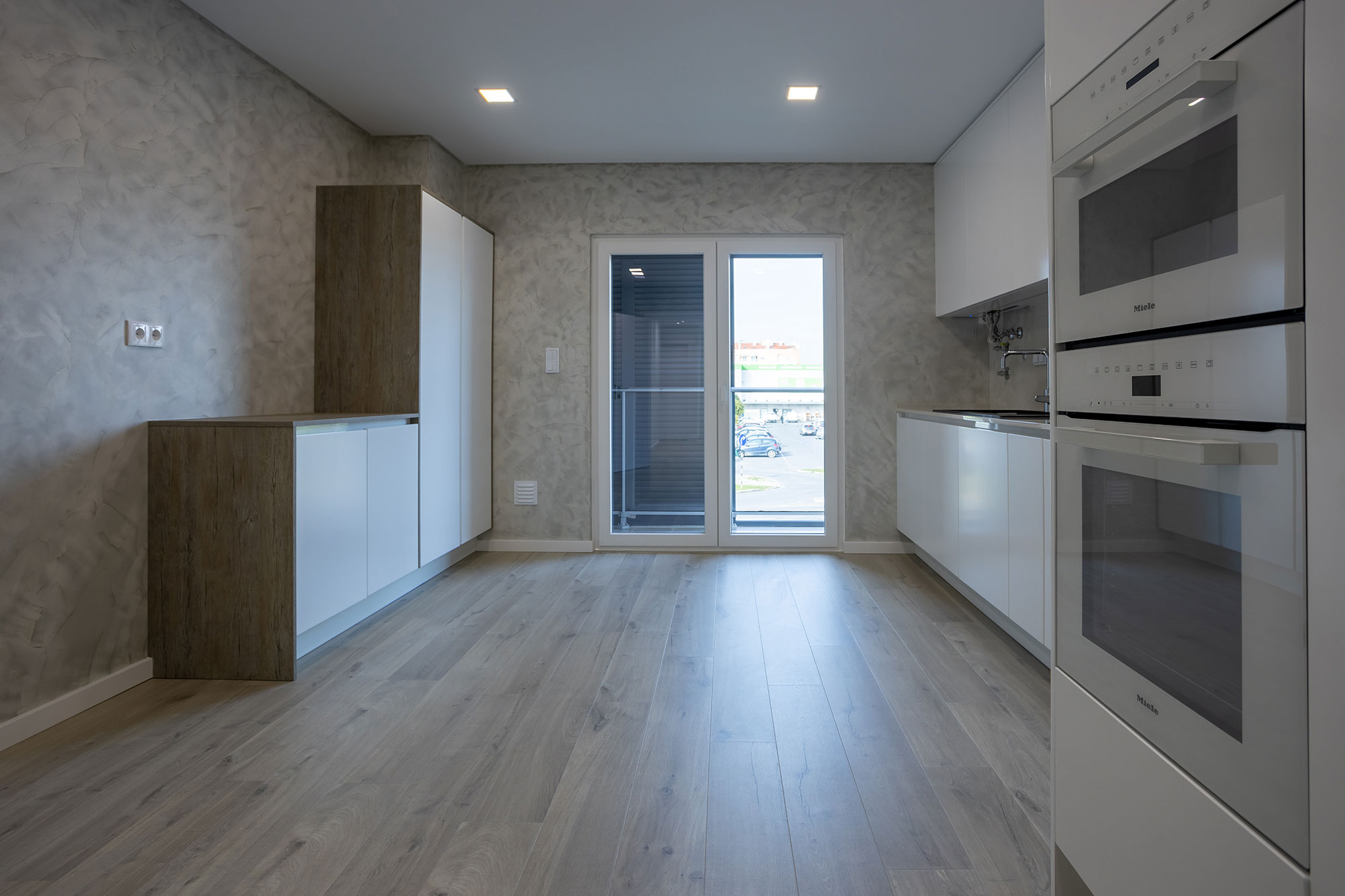 Cozinhas revestidas a Microcimento, móveis lacados branco e madeira de carvalho rústico.